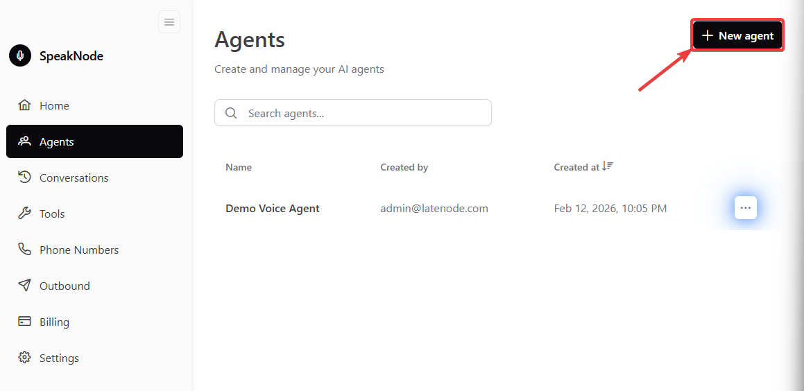 Открываем SpeakNode. В меню слева Agents → + New agent.