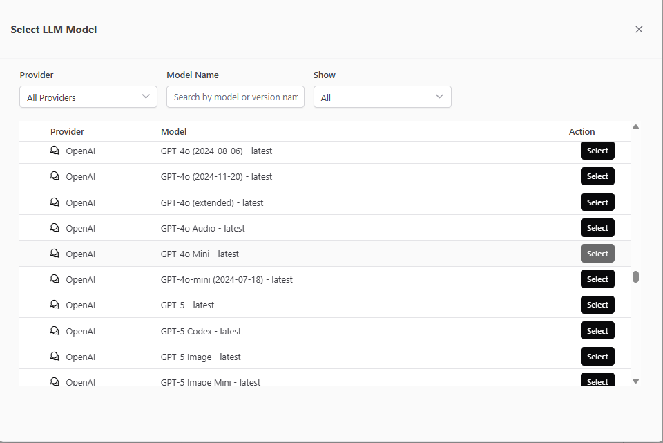 Вторая по важности настройка. Нажав на параметр, откроется окно в котором можно выбрать нейросеть — «мозг» вашего агента — из сотен доступных. Для тестирования достаточно оставить стандарт GPT-4o.